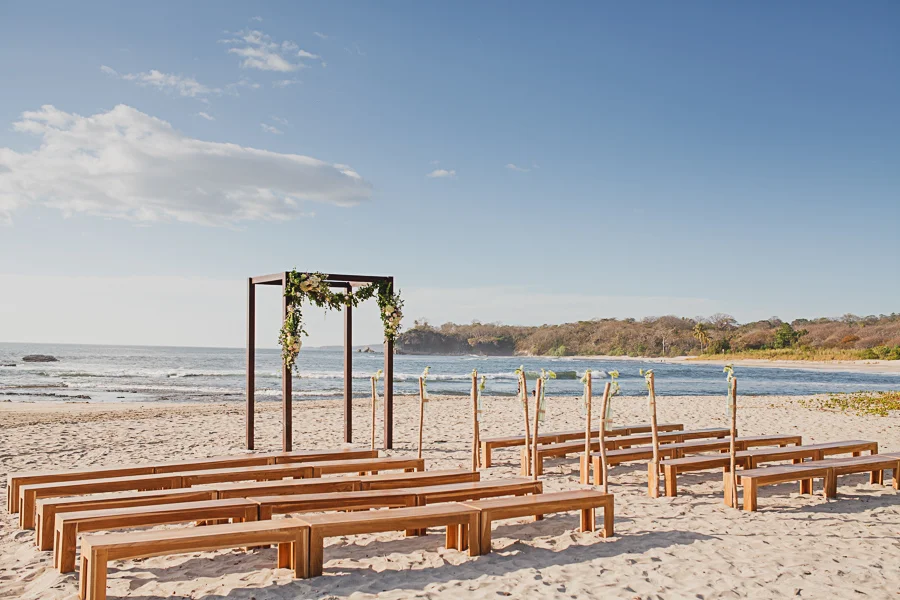 Our benches are made from Costa Rican Teak. They work excellently as ceremony seating as well as reception seating. Each bench can comfortably accommodate 3 people for a ceremony or 2 guests for reception seating