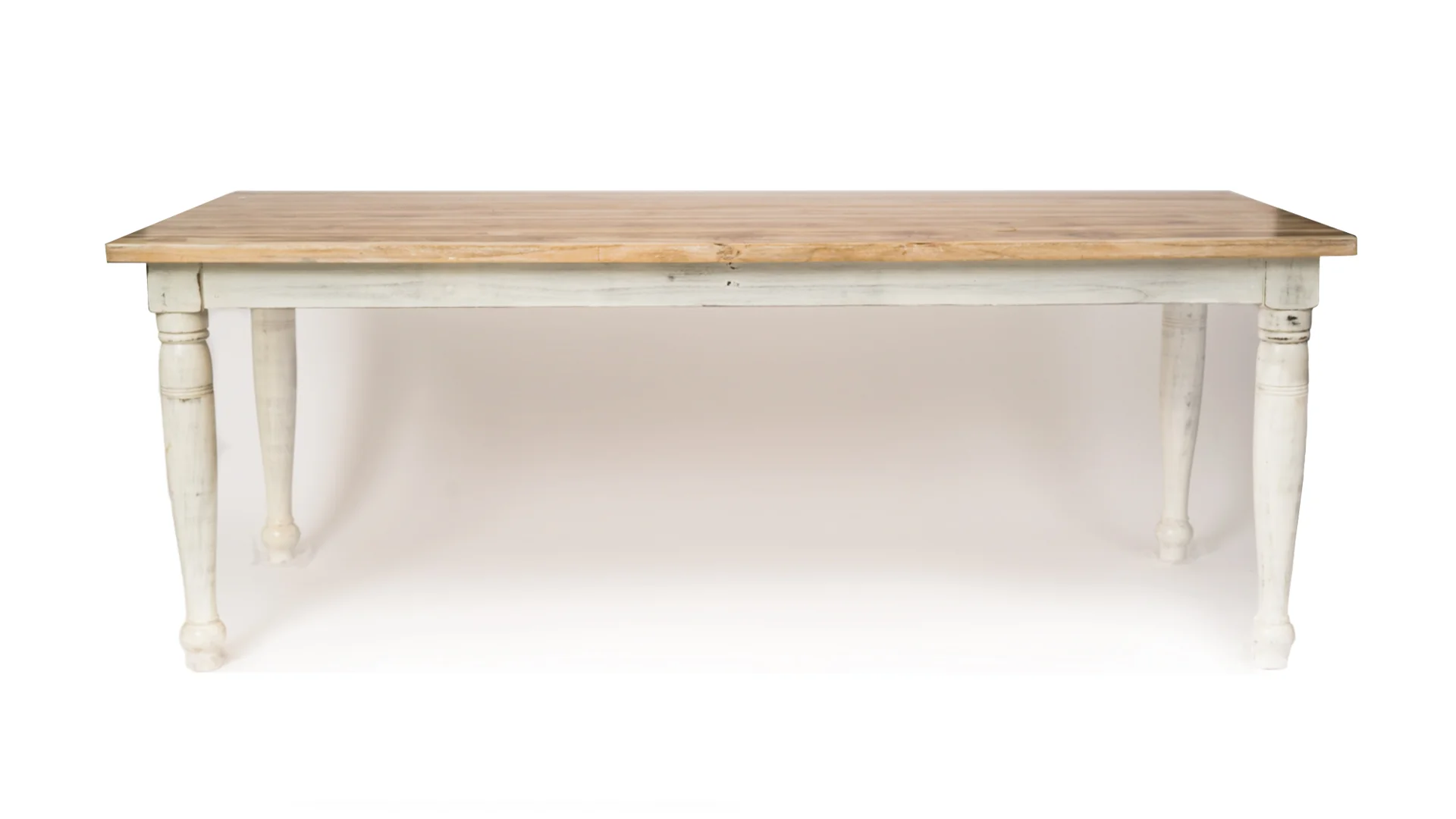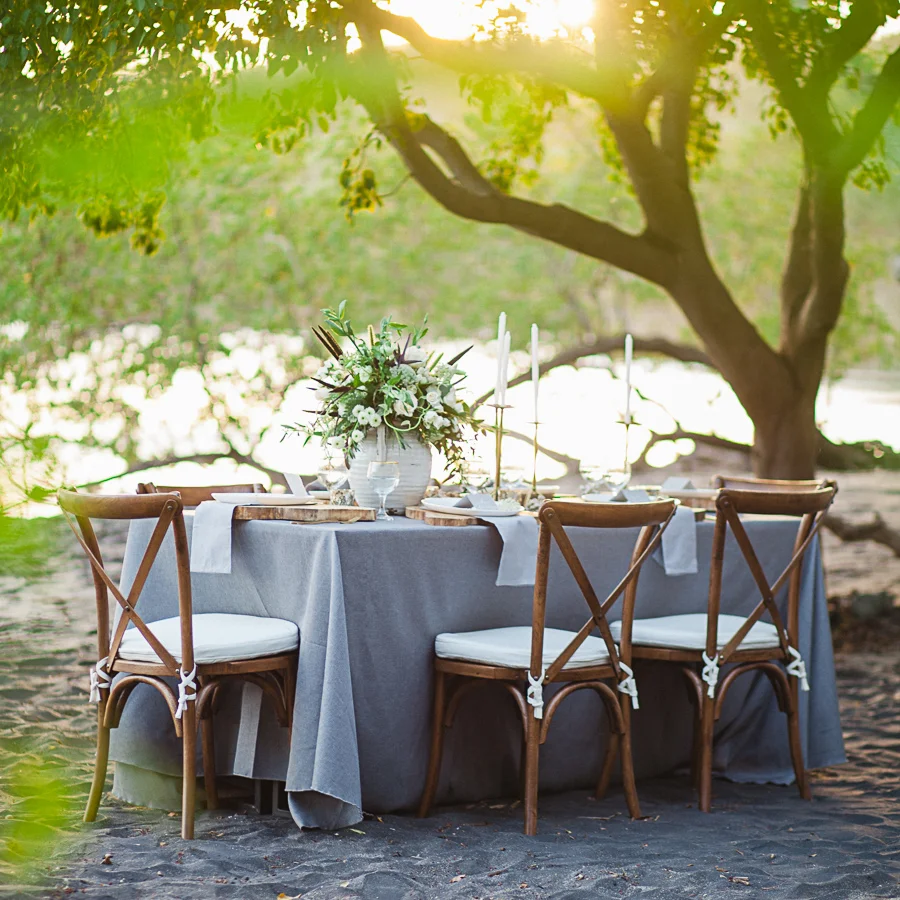 Our teak farm table collection features white grain top grain and distressed leg accents. The table tops are designed with solid Costa Rican teak which has a light and neutral appearance. We custom built these tables and made the dimensions slightly longer than a standard rental table to more comfortably accommodate guests. The tables can be set up singularly to seat 6-8 people or can be connected to create one long, beautiful head table.